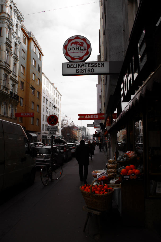 市民市場の前の道。伸びるレールはトラムのレール。